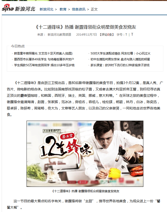 《十二道锋味》是由浙江卫视出品,是80后影帝谢霆锋的美食节目,拍摄3个月12集,是真人秀、广告片、微电影的结合体。比如到法国南部找的松子露,又或者去澳大利亚抓帝王蟹,到印尼寻访真正的麝香猫咖啡,和韩国,西班牙、瑞士、英国、挪威,意大利等。”在环球之旅的美食过程中,谢霆锋会邀请海清,赵薇,张家辉,范冰冰,房祖名,容祖儿,桂纶镁,杨颖,林丹,白冰,陈奕迅,蔡卓妍,陈妍希,周笔畅,佟大为,文章等艺人朋友,以及自己的父亲谢贤,一同和他走访世界各地美食。