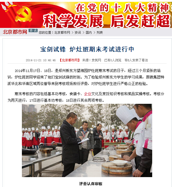 2014年11月17日、18日,是郑州新东方望湘园炉灶班期末考试的日子,经过三个月紧张的培训,炉灶班的同学迎来了他们宝剑试锋的时刻。为了检验郑州新东方学生的学习成果,原微集团特派华北和华南区域两位督导来到考核现场担任评委,对炉灶班学生进行严格公正的检验。