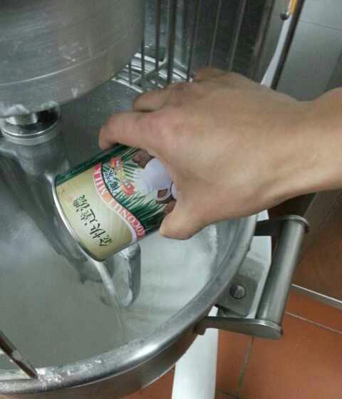 1.糯米粉澄面生粉倒入搅拌机里 加入椰浆(没有搅拌机的就直接倒在盆里)。