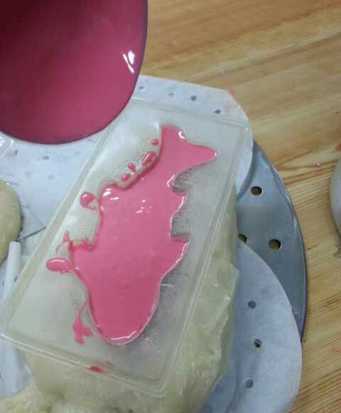 4.用搅拌机搅匀搅匀,(没有搅拌机的可以用筷子)取一勺出来滴上一点食用色.搅匀.把浆倒在模子上你所想要上色的地方,蒸10分钟。