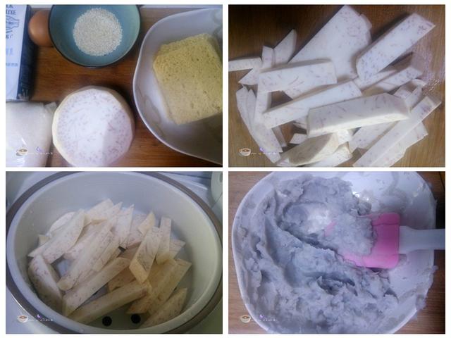 4.蒸熟的香芋里加入白糖、牛奶,碾成泥