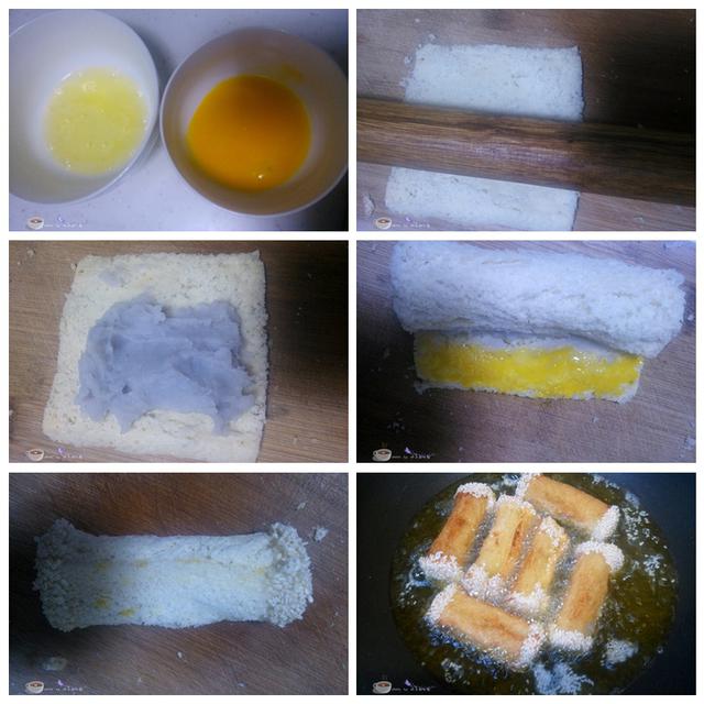 二、面包片包上香芋泥卷起后一定要沾连好,用手再捏一捏,沾牢固;