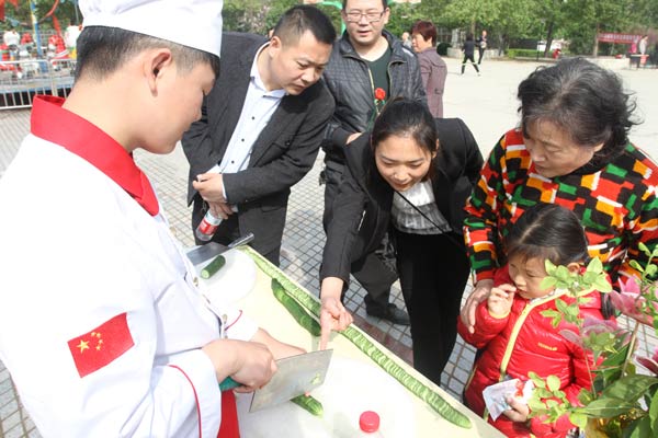 郑州新东方烹饪学校的几教师生在活动现场一出现,就吸引了现场居民的围观。据悉,郑州新东方烹饪学校是应郑州市民间组织管理办公室邀请参加其组织的进社区便民服务活动,作为文化活动的一个环节进行社区居民互动和技能展示,他们现场展示了西瓜雕刻,花朵雕刻,动植物雕刻等多种雕刻技能,还展示了中国传统的面塑技能和精湛的蓑衣花刀的刀法。新东方师生们的作品都栩栩如生,惟妙惟肖,引起现场居民的围观和关注,他们纷纷为新东方师生竖起了大拇指。当一些老人和孩子收到新东方的作品作为礼物时,他们脸上露出了灿烂的笑容。
